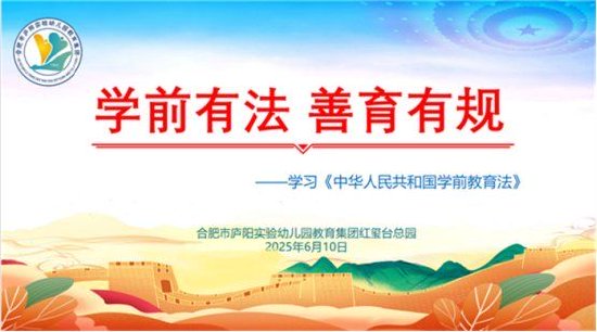每一条法规,都是守护童年的铠甲,每一项规定,都是浇灌成长的甘露。在《中华人民共和国学前教育法》的指引下,庐阳实验幼儿园教育集团红玺台总园将继续将认真贯彻落实法律法规要求,不断规范办园行为,提升保育教育质量,为幼儿营造安全、健康、和谐的成长环境,以法治之力护航幼儿茁壮成长。(王欣仪)