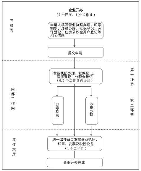 1.强化流程再造。各相关部门要按照“手续更简,环节更少,成本更低,效率更高”原则,对各自的相关业务系统进行改造重塑,将必要的后续事项与营业执照申领合并,构建企业网上申报、部门网上审批、证章和税控设备免费寄递“零见面”的企业开办服务新流程。申请人一次登录企业开办“一窗通”系统,一表填报与营业执照申领、印章刻制、涉税办理、社保登记、医保登记、住房公积金开户登记等相关信息,实现在线申请、在线签名、在线选择预约开户银行网点。相关部门在规定时间内完成网上审批,审批结果后台流转,统一出件窗口发放营业执照、印章、发票及税控设备。