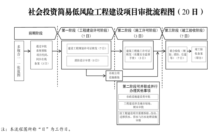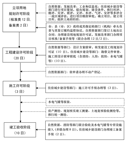 注: 1. 图中虚线部分表示由政府部门、单位提前介入事项或企业申报, 有关部门、单位并行办理,但不计入主流程审批(审查)时间的事项。建设单位按要求整改时间,不计入审批时间。