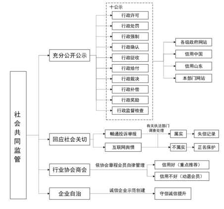一是依法依规推动信用信息公开公示,做到“应公开、尽公开”,从行政许可、行政处罚“双公示”升级为行政许可、行政处罚、行政强制、行政确认、行政征收、行政给付、行政裁决、行政补偿、行政奖励、行政监督检查等“十公示”。二是监测整合12345、12315等各类投诉举报信息、互联网重大舆情监测信息,经有关部门调查核实处理后,纳入失信记录并作为失信信息依法公开公示。三是充分发挥信用服务机构和行业协会商会等社会力量作用,支持其协助有关部门开展第三方监管。四是广泛开展形式多样的诚信示范企业创建活动,引导企业设立信用监督岗位,加强企业内部诚信管理,提升企业守法诚信经营意识。