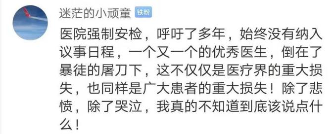 对于伤医我们已出离愤怒,强烈谴责暴行的发生,对杨文医师的不幸离世表达深切地哀悼,对家属表示慰问。