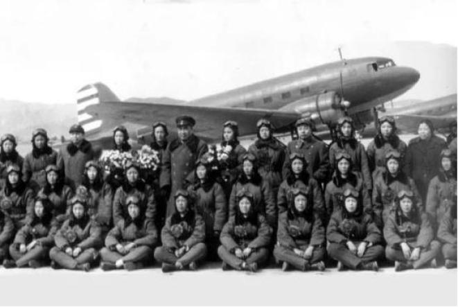 (1951年,中央军委从全国航校招收55名女学员组建女飞行员班,1952年3月8日,中华人民共和国第一批女飞行员驾驶飞机飞过天安门上空。图为中国人民解放军总司令朱德接见首飞成功的中华人民共和国第一批女飞行员。)
