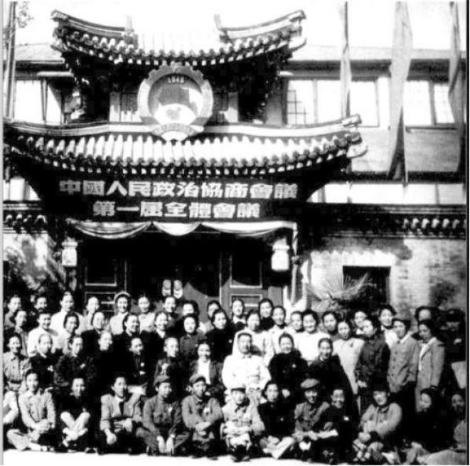 (参加中国人民政治协商会议第一届全体会议的女代表有69名,图为参加会议的女代表与领导合影)