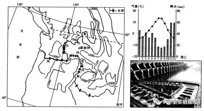 下图甲为哥伦比亚河流域等高线地形图,图乙为斯波坎气温降水图,图丙为水电大坝及坝侧敷设的连接大坝上、下的流水回廊图。