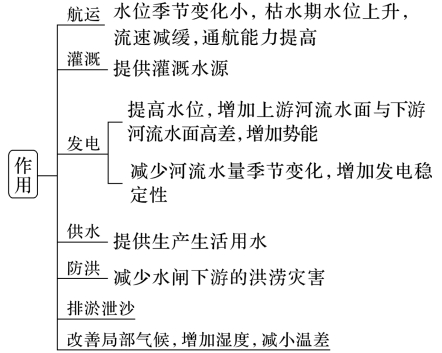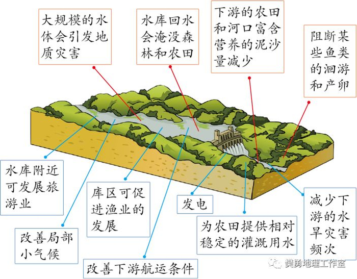 (5)对社会经济的影响:①大型水库往往和水电站同时建设,发展经济,增加电力供应;②为库区周围和下游提供充足的灌溉水源,实现农业稳产、增产;③库区周围若有地势较低的水稻田,可能导致排水不良,单产减少;④利用水库发展水产养殖业;⑤利用水库发展旅游业,如水上游乐项目;⑥库区上游地区水深增加,河道拓宽,通航里程和通航能力会增加;原有港口,停泊船只吨位提升,港口规模扩大,经济腹地也会变大。