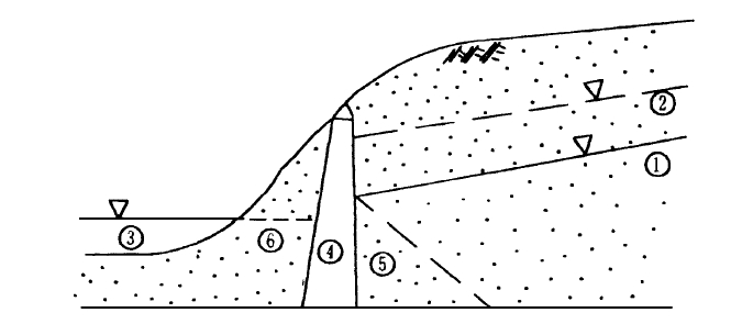 (①—原始地下水位;②—建库后坝内地下水位;③—海水位;④—地下水坝;⑤—地下水库咸水残留体;⑥—建库后坝外地下水位)