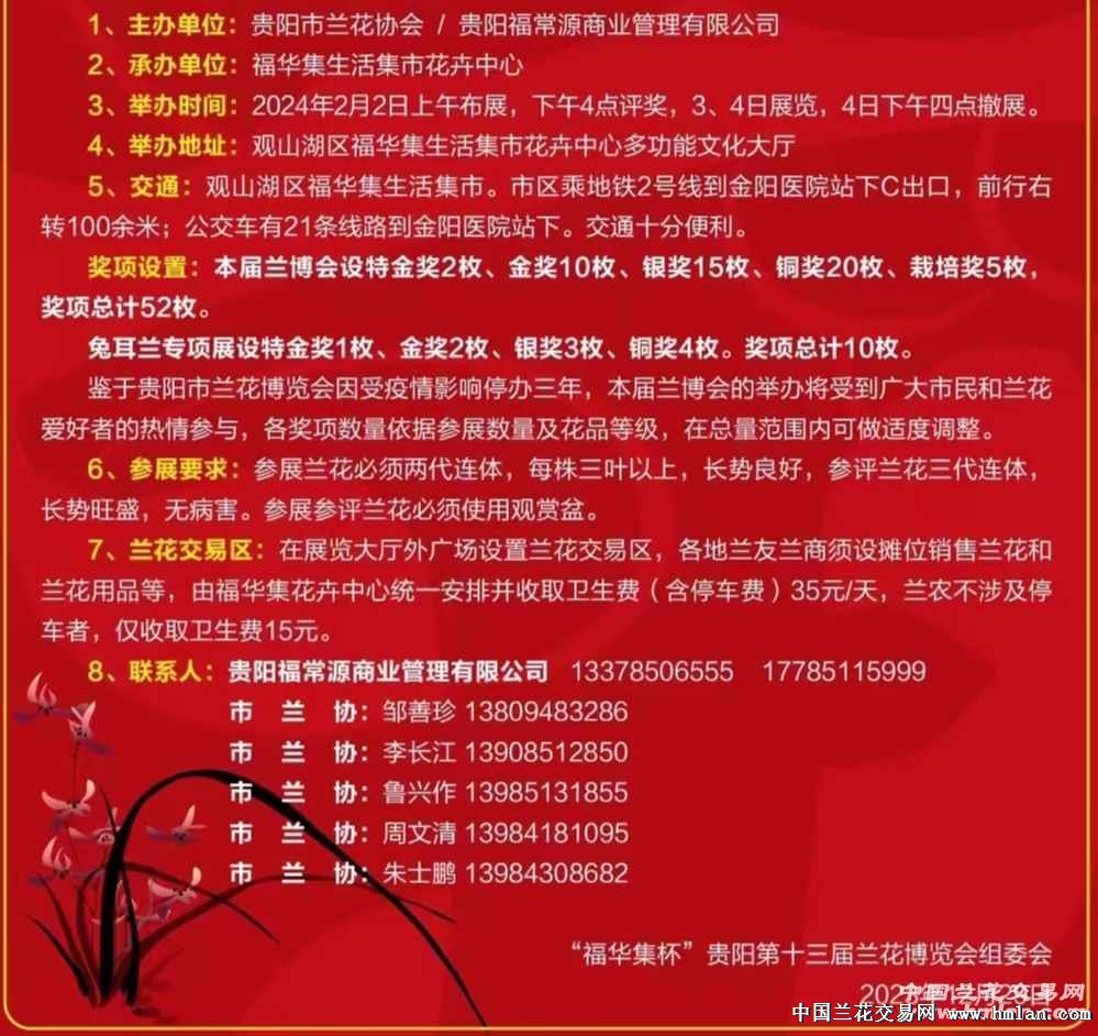 【八】 2024年2月2日-4日,贵州省贵阳第十三届“福华集杯”兰花博览会,将在贵阳市观山湖区福华集生活集市花卉中心举行,并设60余项大奖,奖金可观。联系人:邹善珍 13809483286