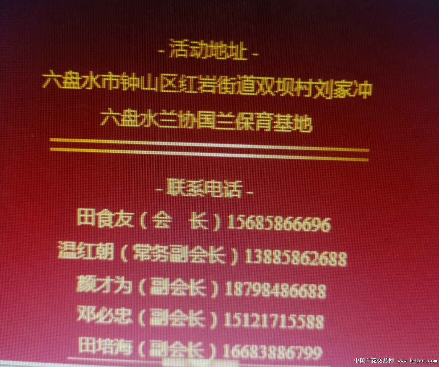 【六】 2024年 1月30日-31日,召开第三届西南兰花联谊会暨贵州省六盘水市兰花交易会,具体地点:六盘水钟山区红岩街道双坝村刘家冲(六盘水兰协国兰保育基地)联系人:田食友(会长)15685866696