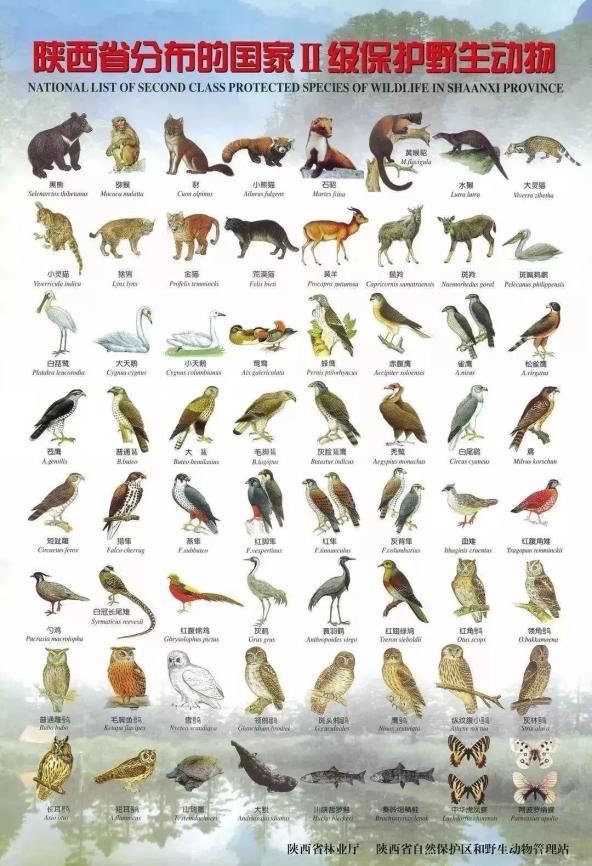 二级国家重点保护野生动物有65种,包括猕猴、豺、黑熊、小熊猫、石貂、斑嘴鹈鹕等。列入陕西省级的重点保护野生动物有52种,包括狼、赤狐、苍鹭、画眉、红嘴相思鸟等。
