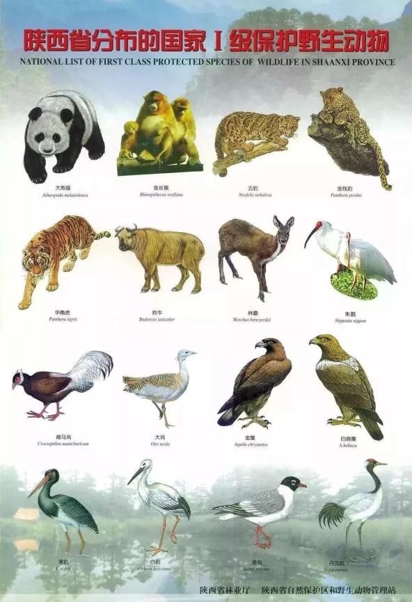 陕西省分布的一级国家重点保护野生动物有16种,包括金丝猴、大熊猫、云豹、豹虎、羚牛、朱鹮、丹顶鹤、林麝等。