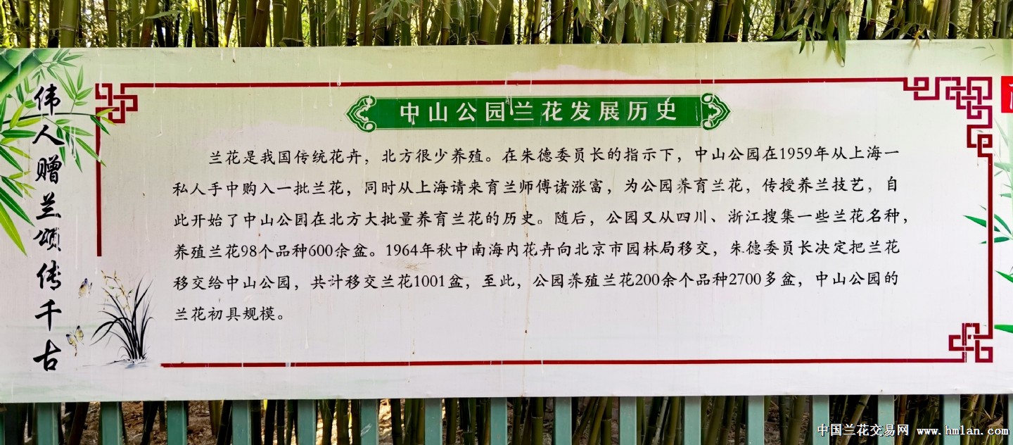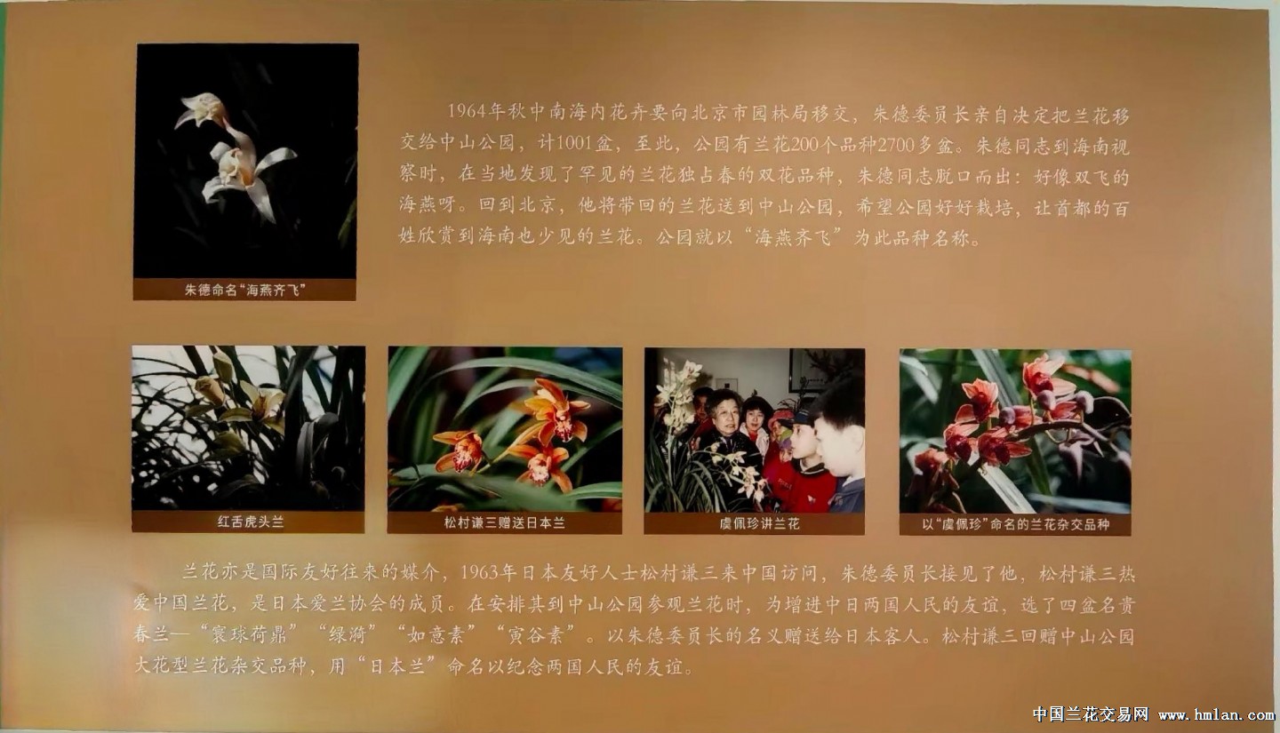 朱委员长一心想让兰花走进寻常百姓家,指示北京中山公园要多办兰展。1964年将自己精心收集的1001盆兰花送给北京中山公园,除1969年-1971年3年因中山公园改扩建闭园外, 1972年起北京中山公园坚持不间断兰展50多年,现在更是全年都有展出,春兰、蕙兰、建兰、寒兰、墨兰四季花香不断。