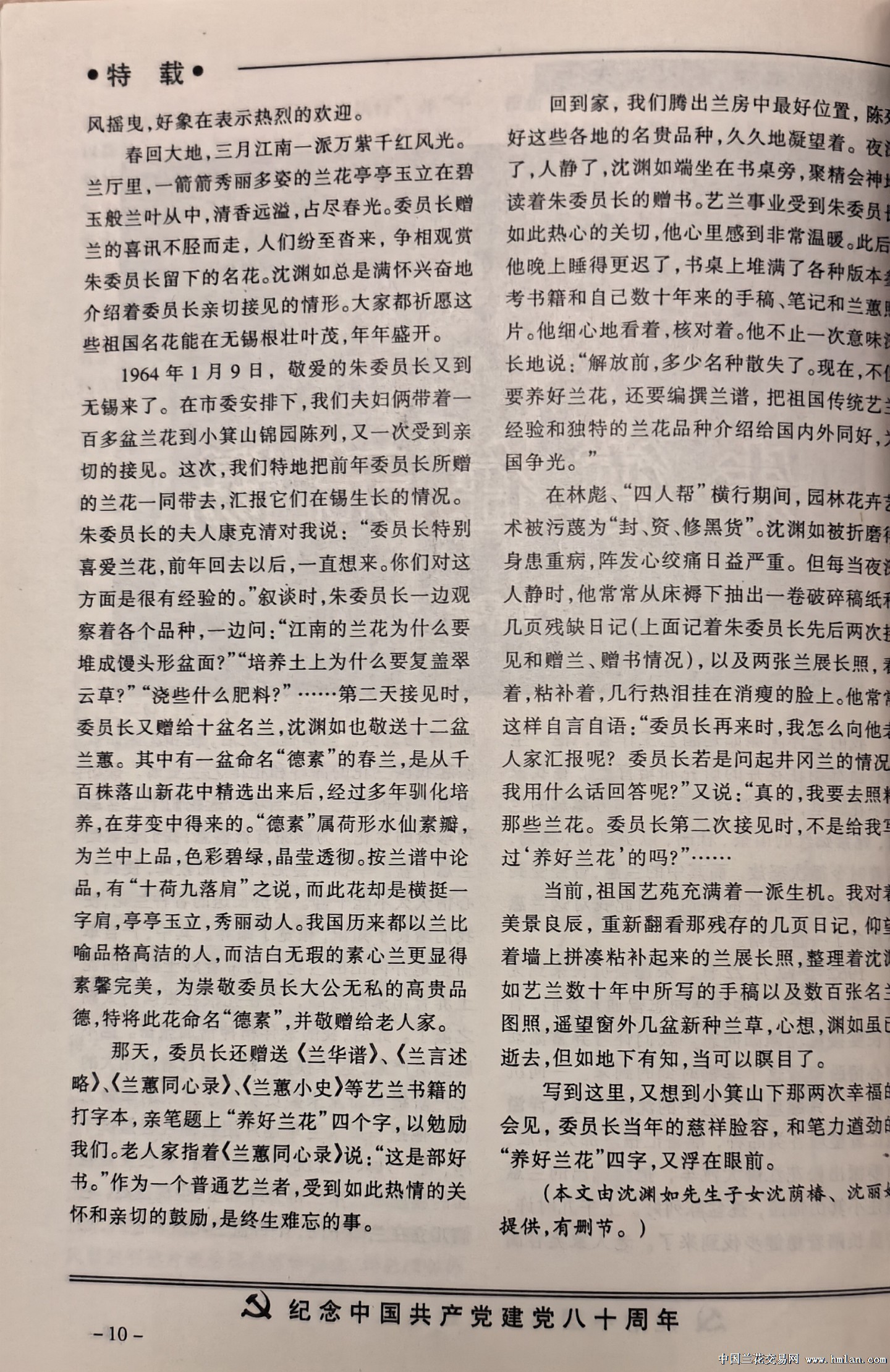 在无锡两次会见沈渊如时,朱老总总是聊起云南、四川大山中的红花红舌,引得“江南兰王”也心驰神往。二人互赠22盆兰花,沈渊如将自己精心培育的一盆春兰素心,命名“德素”相送。 沈渊如所送兰花后来全部进入北京中山公园,时常见展出。