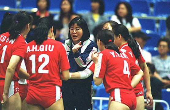 1998年12月在泰国曼谷亚运会女排比赛中,中国女排主教练郎平在现场指导。