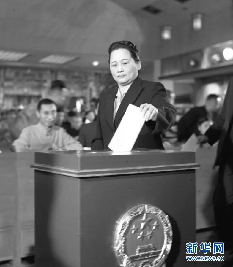 1954年9月27日,中华人民共和国第一届全国人民代表大会第一次会议用无记名方式投票选举中华人民共和国主席、副主席,全国人民代表大会常务委员会委员长、副委员长、秘书长和委员,最高人民法院院长,最高人民检察院检察长,并通过国务院总理人选。图为宋庆龄在投票。(资料照片)