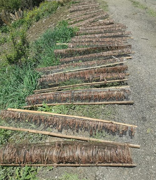 “从2021年夏天开始,有来自河南、安徽、四川等地的收购商带着‘地龙仪’来到我们村。他们会事先租几户村里的民房,将设备免费发放给附近村民。等我们到山上捉到野生蚯蚓后,再卖给他们,他们还会雇用十多个妇女给蚯蚓开肚、清洗、晾晒。通过这样‘一条龙’式流程,蚯蚓干就制成了。在旺季,收购蚯蚓干的中间商,一天能收千余斤蚯蚓干。”二塘镇某村的村民李大爷描述了此前蚯蚓加工厂的“繁盛”景象。李大爷说,正常情况下,他一人使用“地龙仪”每天能轻松捕获近百斤蚯蚓。
