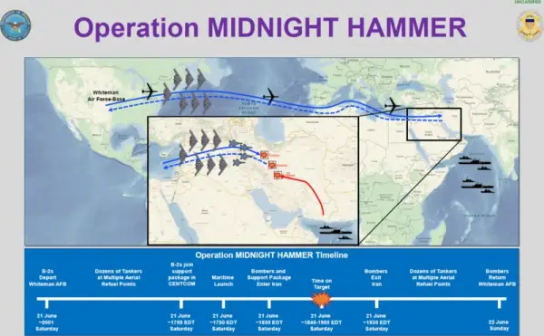 根据凯恩发布的美军行动时间线,美国东部时间周五午夜,B-2轰炸机群从密苏里州惠特曼空军基地起飞,7架构成的主力向东横跨大西洋,在长达18个小时的飞行中仅维持最低限度的通信。而另一部分B-2向西飞越太平洋,作为诱饵,迷惑外界。