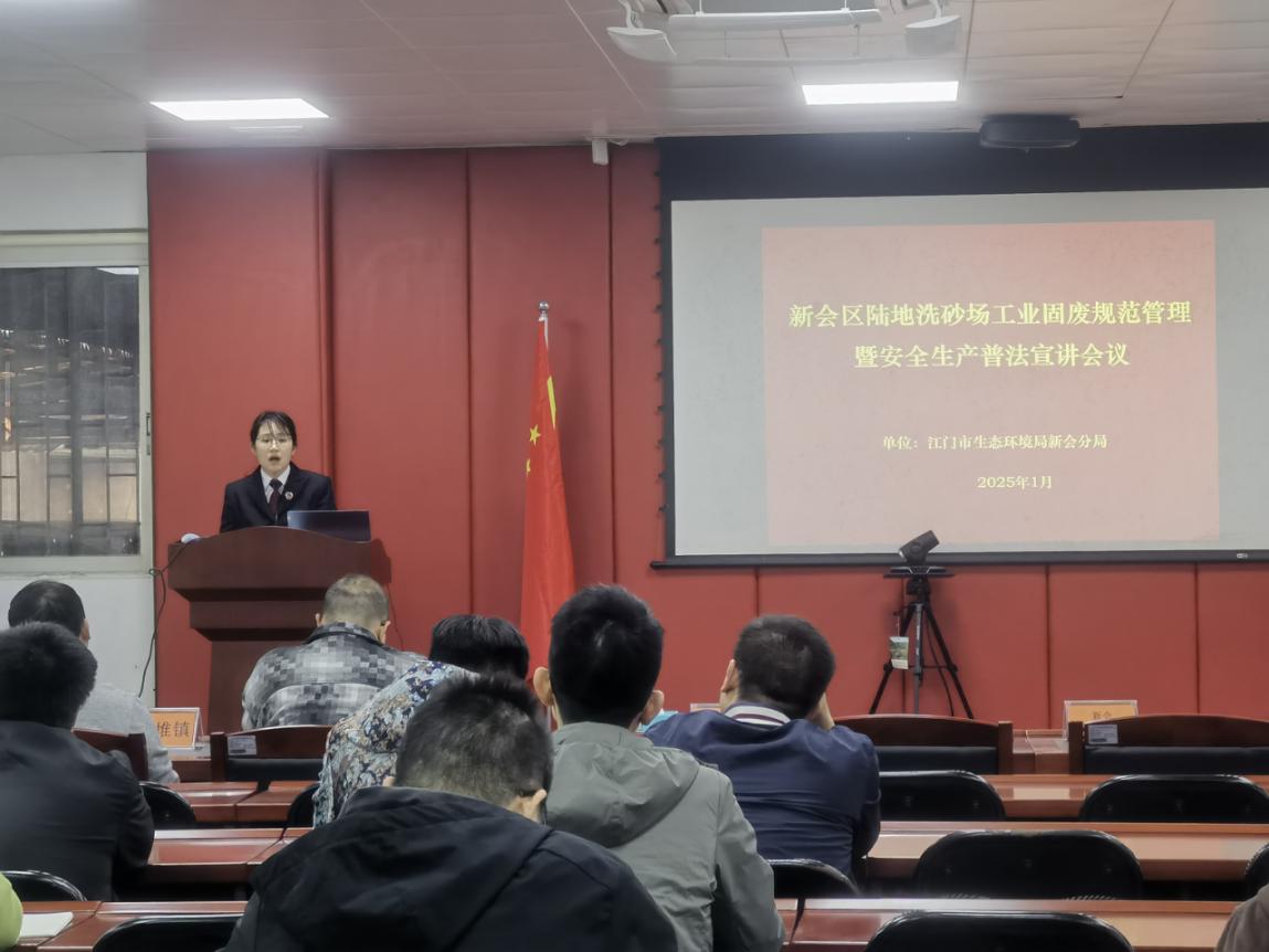 为进一步规范陆地洗砂场工业固体废物管理工作,提升全区工业固废规范化管理水平筑牢岁末年初工业固废领域环境安全防线,近日,江门市生态环境局新会分局联合新会区检察院召开陆地洗砂场工业固废规范管理暨安全生产普法宣讲会议,指导帮扶洗砂洗泥企业解决污染防治难题。新会区18家涉洗砂洗泥企业代表和相关镇(街)生态环境工作业务骨干参加此次培训会议。