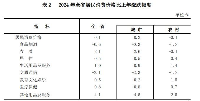 全年全省居民消费价格比上年上涨0.1%。工业生产者出厂价格下降6.7%。工业生产者购进价格下降5.0%。农产品生产者价格下降3.4%。