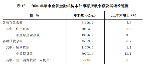 年末全省金融机构本外币各项存款余额61126.2亿元,比上年末增长5.6%,比年初增加3262.9亿元。各项贷款余额45599.9亿元,比上年末增长8.7%,比年初增加3655.8亿元。