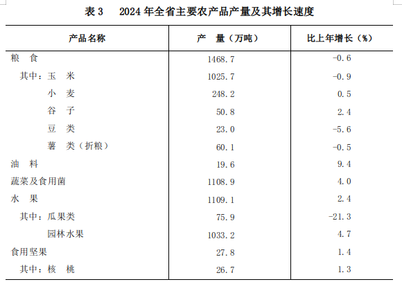 全年全省农作物种植面积3638.3千公顷,比上年减少3.4千公顷。其中,粮食种植面积3151.6千公顷,减少9.3千公顷;油料种植面积106.4千公顷,增加8.4千公顷;中草药材种植面积104.7千公顷,增加3.1千公顷;蔬菜种植面积231.0千公顷,增加4.0千公顷。在粮食种植面积中,玉米种植面积1835.5千公顷,减少6.7千公顷;小麦种植面积527.9千公顷,减少8.0千公顷。果园面积379.1千公顷,减少1.2千公顷。