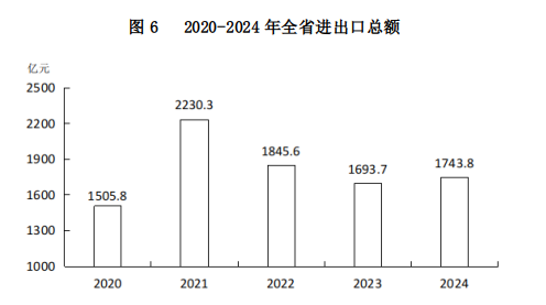 全年全省进出口总额1743.8亿元,比上年增长3.1%。其中,出口额1065.7亿元,增长1.5%;进口额678.1亿元,增长5.8%。对共建“一带一路”[11]国家进出口额875.7亿元,增长17.0%。其中,出口额447.1亿元,增长16.0%;进口额428.6亿元,增长18.0%。
