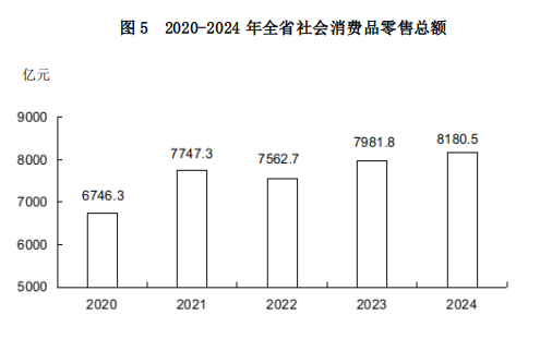全年全省社会消费品零售总额8180.5亿元,比上年增长2.5%。按经营地分,城镇消费品零售额6738.1亿元,增长2.3%;乡村消费品零售额1442.5亿元,增长3.5%。按消费类型分,商品零售额7298.2亿元,增长2.3%;餐饮收入882.3亿元,增长4.2%。