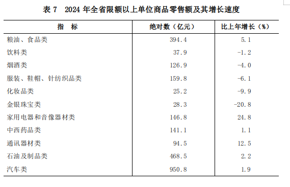 全年全省限额以上单位消费品零售额3010.5亿元,比上年增长1.9%。其中,粮油、食品类零售额增长5.1%,家用电器和音像器材类增长24.8%,中西药品类增长1.1%,通讯器材类增长12.5%,石油及制品类增长2.2%,汽车类增长1.9%。
