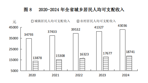 全年全省居民人均可支配收入32441元,比上年增长4.9%;居民人均消费支出21090元,增长6.8%。按常住地分,城镇居民人均可支配收入43036元,增长4.1%,城镇居民人均消费支出26089元,增长6.4%;农村居民人均可支配收入18741元,增长6.0%,农村居民人均消费支出14626元,增长6.9%。全省城乡居民人均可支配收入比值为2.30,比上年缩小0.04。全省居民恩格尔系数为26.6%,其中城镇为25.3%,农村为29.4%。
