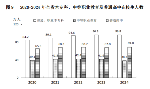 全年全省研究生教育招生2.2万人,在学研究生6.4万人,毕业生1.8万人。普通本科招生15.0万人,在校生55.4万人,毕业生14.6万人。职业本专科招生13.7万人,在校生41.4万人,毕业生12.9万人。中等职业教育招生12.7万人,在校生38.7万人,毕业生14.5万人。普通高中招生25.7万人,在校生69.8万人,毕业生23.6万人。初中招生38.8万人,在校生114.4万人,毕业生37.1万人。小学招生34.6万人,在校生226.4万人,毕业生39.9万人。特殊教育招生0.3万人,在校生2.0万人,毕业生0.4万人。学前教育在园幼儿82.1万人。