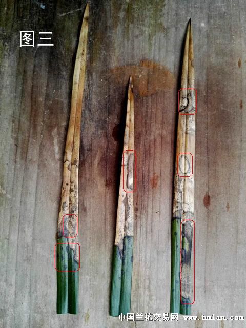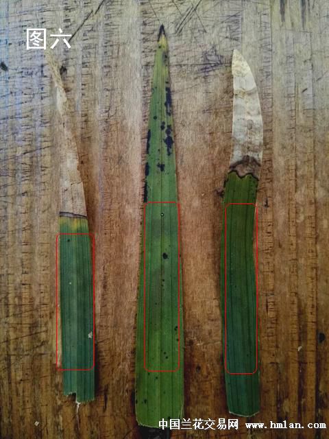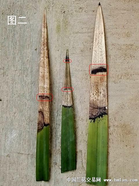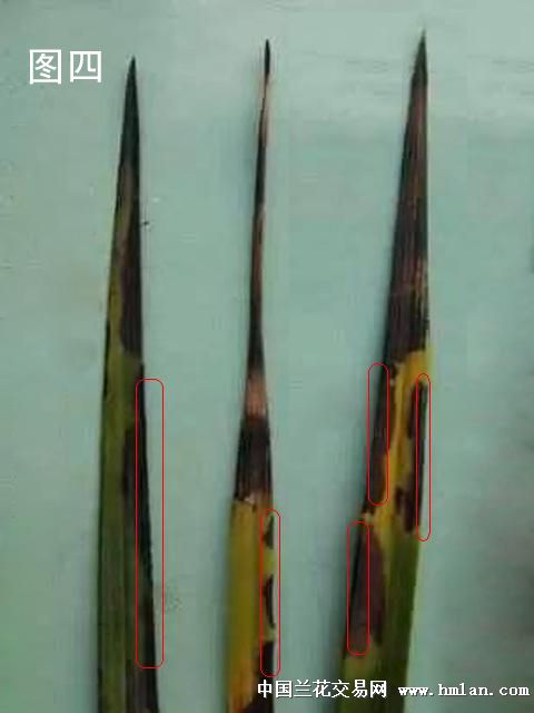 一、缺水。这种焦尖从形态上看,焦尖部份颜色深浅基本一致(见图一黄色圈标记),焦尖与正常兰叶交界线平直,且分界明显(见图一红色圈标记),正常兰叶上不会有其他斑点(见图一蓝色圈标记)。如果连续多年有缺水焦尖有情况,在焦尖部位能见到每年焦尖时留下的平直分界线(见图二红色圈标记)。这种焦尖是由于兰草体内生长水过少(生理性缺水)造成的,也是兰草焦尖的最主要的原因。生理性缺水主要原因也有三种。一是浇水太少,兰草吸不到足够的水份。二是浇水过多,使兰草闷根,影响兰草吸水。三是兰盆内水份浓度过高,影响兰草了吸水。如浓肥浓药,植料中可溶性盐过多使盆内水份浓度过高。