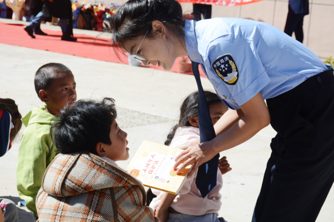 ▲2025年2月,工作人员在郎木寺镇中心小学向青少年宣传未成年人保护法。