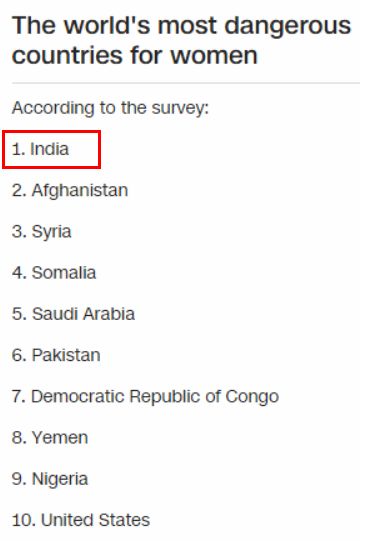 ▲在去年的一项名为“全球对女性最危险的国家地区”的调查中,印度高居第一 (图viaCNN)
