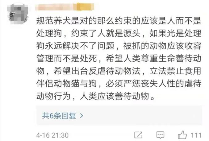 也有网友提出,规范养犬应对狗主人提出更高的要求和约束。人类应当尊重生命,反对虐待动物: