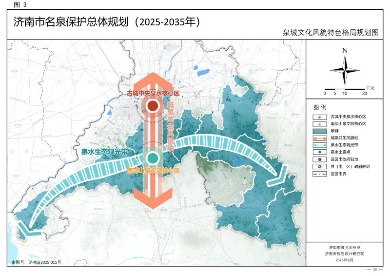 两核:北部依托老城四大泉群打造古城中央泉水核心区,集中展现“泉·城文化景观”;南部依托涌泉泉群打造南部山泉文旅核心区,彰显泉水自然生态风貌,助力区域乡村振兴。