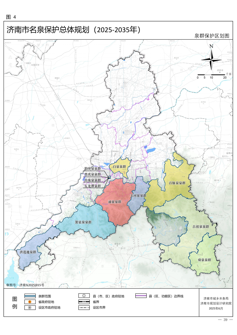 根据泉水出露点分布情况,结合历史人文要素、自然生态条件以及行政管辖事权,划定趵突泉泉群、黑虎泉泉群、珍珠泉泉群、五龙潭泉群、白泉泉群、涌泉泉群、百脉泉泉群、玉河泉泉群、袈裟泉泉群、洪范池泉群、吕祖泉泉群及舜泉泉群的保护区划。