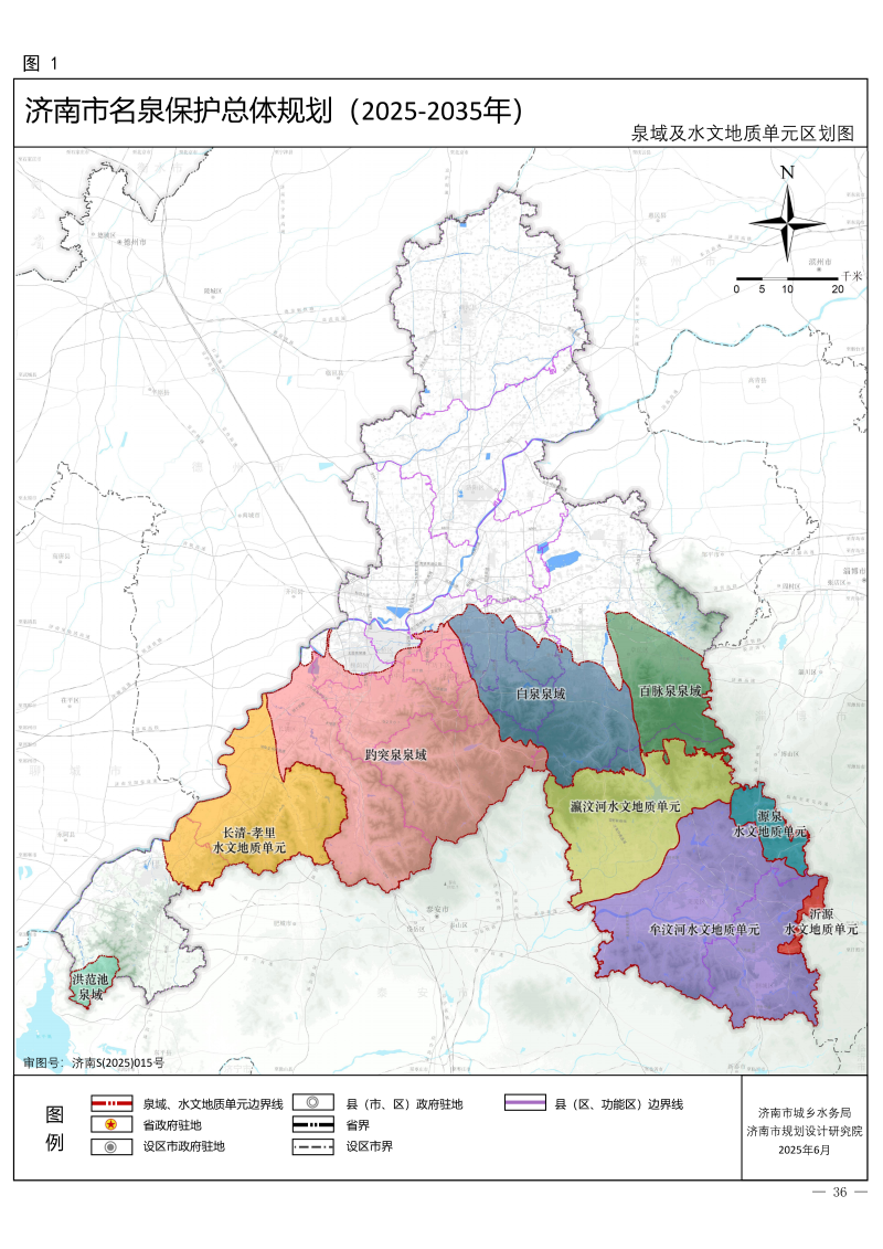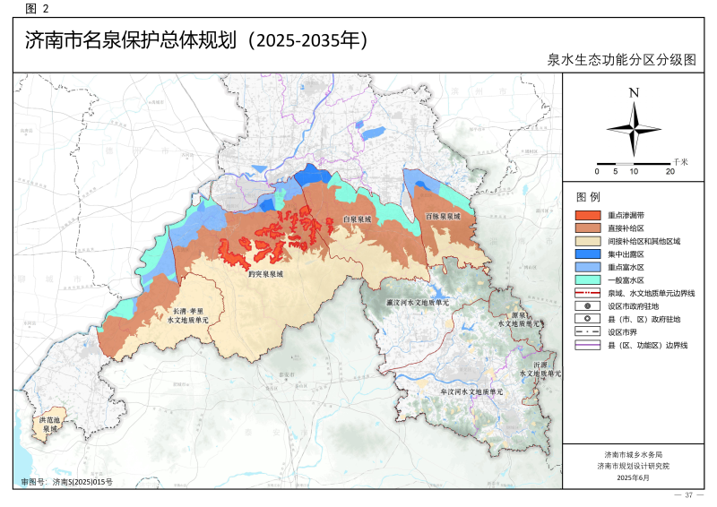 依据济南市名泉保护总体规划有关地质专项成果,确定趵突泉泉域、白泉泉域、百脉泉泉域、洪范池泉域等4个泉域,以及长清—孝里水文地质单元、瀛汶河水文地质单元、牟汶河水文地质单元、源泉水文地质单元、沂源水文地质单元等5个水文地质单元的保护区划。