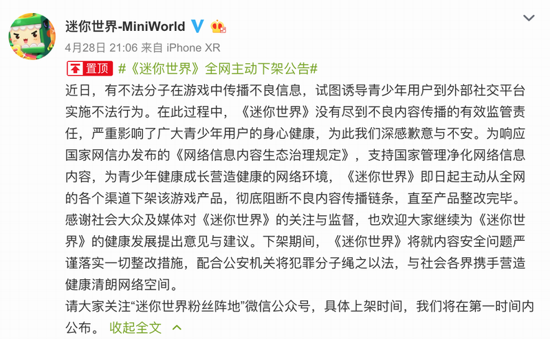 4月28日凌晨和晚间,迷你世界官方微博发布两条公告,称即日起主动从全网的各个渠道下架该游戏产品,直至产品整改完毕。同时启动最高等级内容监管限制。具体上架时间,将在第一时间内公布。