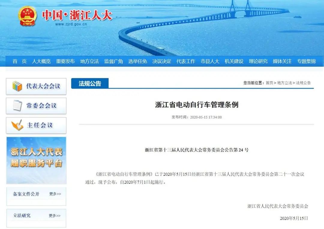 5月15日下午,《浙江省电动自行车管理条例》通过审议,将在7月1日起正式实施。