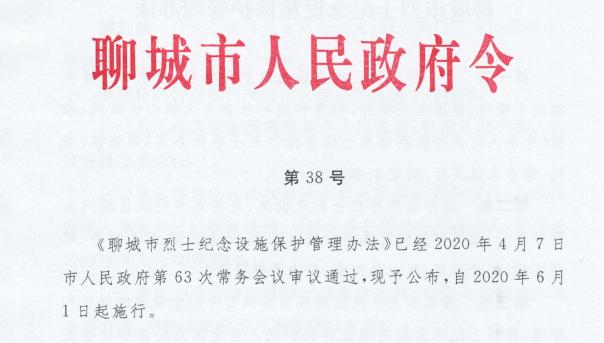 我市现有省级烈士纪念设施3处、市级烈士纪念设施5处、县级烈士纪念设施11处,零散烈士纪念设施近百处。这些烈士纪念设施记录着无数聊城儿女为实现中国革命胜利、国家繁荣、人民幸福而英勇献身的丰功伟绩,是缅怀英雄烈士、教育群众、进行爱国主义教育的重要基地,是弘扬英烈精神和培育民族团结力、向心力的重要载体。从一定意义上说,烈士纪念设施是一部记录革命历史的教科书,是一本增强民族凝聚力的好教材。保护好、管理好烈士纪念设施既是对英雄烈士的尊重,更是我们的责任。《聊城市烈士纪念设施保护管理办法》已经2020年4月7日市人民政府第63次常务会议审议通过,现予公布,自2020年6月1日起施行。