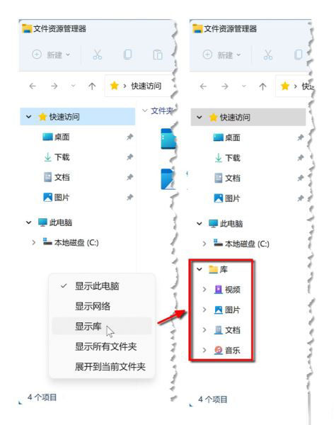 5.巧用“库”整理文件 首先需要打开(显示)文件资源管理器的“库”,在导航窗格的下方空白处右击,然后点击【显示库】菜单项即可。