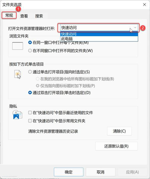 在打开【文件夹选项】对话框中,切换至【常规】选项卡,在下拉框中选择默认打开的位置即可。