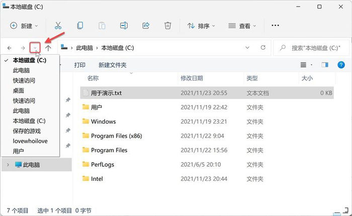 在多次切换磁盘或目录后,会留下一些访问历史记录,点击红色框标记的下拉按钮,即可看到访问的历史记录。