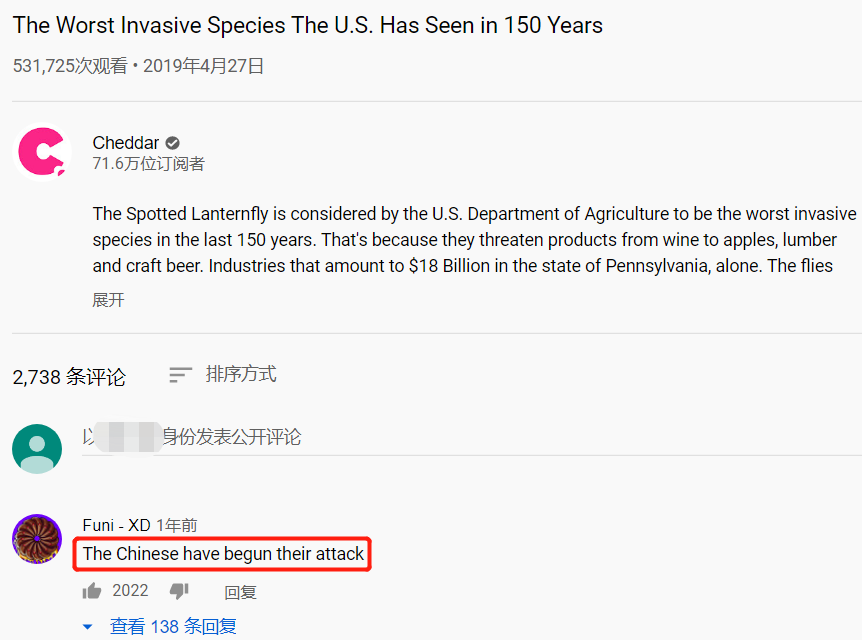 一条斑衣蜡蝉科普视频下,有评论把矛头直指我国