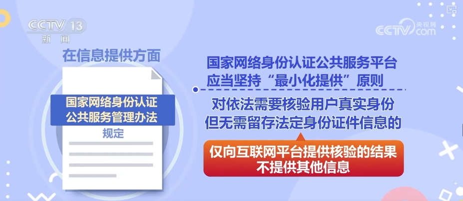 在信息提供方面,《管理办法》规定,国家网络身份认证公共服务平台应当坚持“最小化提供”原则,对依法需要核验用户真实身份但无需留存法定身份证件信息的,仅向互联网平台提供核验的结果,不提供其他信息。对依法确需获取、留存用户法定身份证件信息的,经用户单独同意,公共服务平台可以向互联网平台提供必要的明文身份信息。
