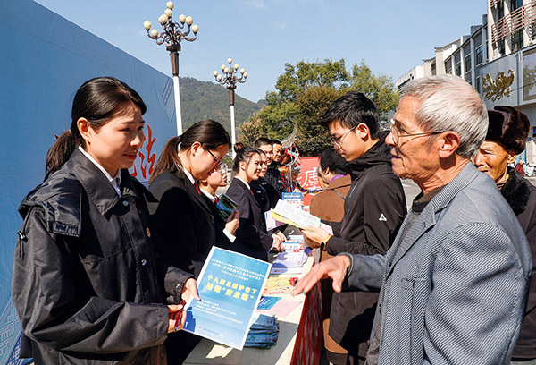 2021年11月12日,景宁畲族自治县鹤溪河畔,工作人员在向过往群众宣传个人信息保护法。图/中新社发 李肃人 摄