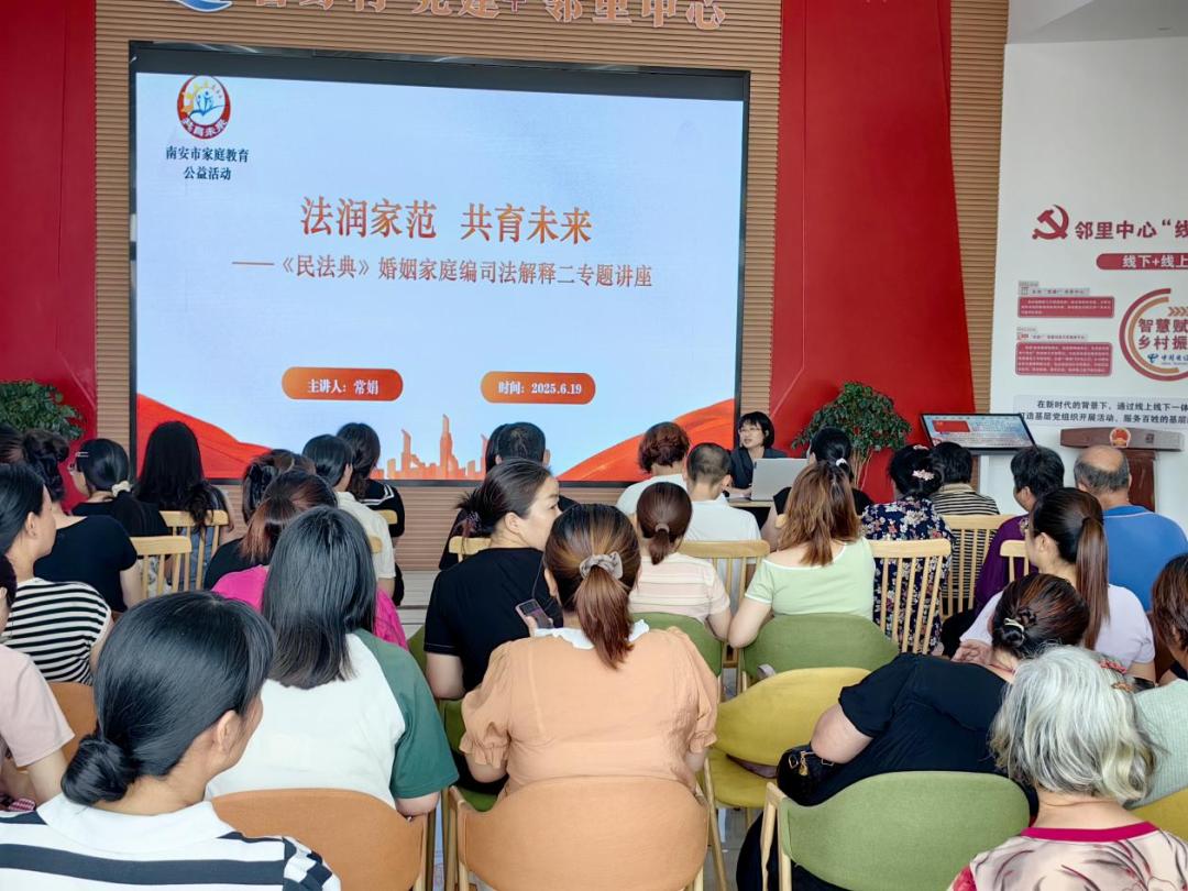 为切实推进家庭教育公益讲座“五进”为民办实事项目,南安法院联合南安市委政法委、市妇联开展“共育未来”家庭教育公益讲座系列活动。近日,南安法院干警前往省新镇省身村家庭教育驿站开展“法润家范·共育未来”《民法典》婚姻家庭编讲座,围绕司法解释中的重点条款深入细致讲解,加深了到场群众对民法典婚姻家庭编内容的认识理解,有效促进婚姻家庭矛盾纠纷预防化解。
