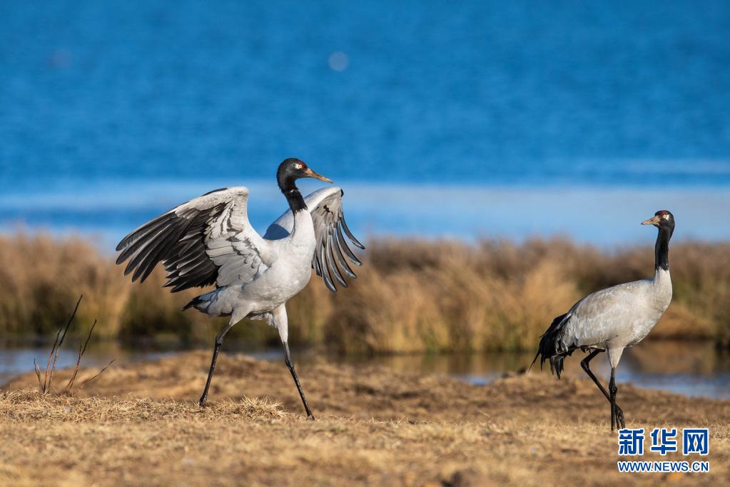 黑颈鹤在云南省昭通市大山包大海子湿地嬉戏(2月24日摄)。新华社记者 胡超 摄