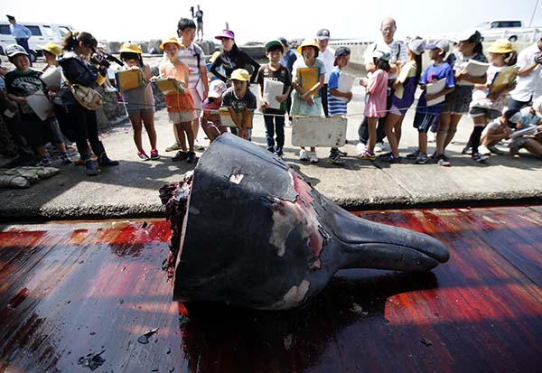当地时间6月26日,日本千叶工人捕杀了一头贝氏喙鲸,标志着日本一年一度捕鲸季节拉开帷幕。当天,千叶市屠鲸厂组织了日本在校学生围观宰杀鲸鱼的过程,并将割下的鲸肉分发给在场的人。
