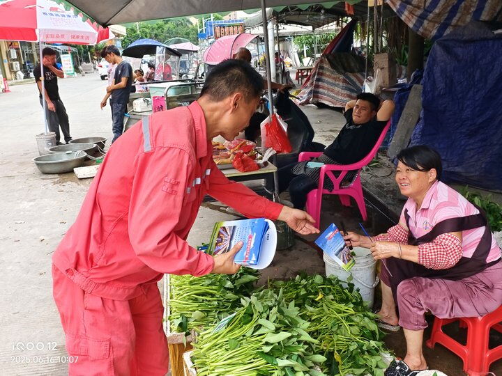 针对雨季防汛形势,中原油田驻南方省市各项目部积极与甲方联合开展管道保护安全知识宣传,警示沿线群众增强管道保护意识,共筑“放心管道”安全防线。图为7月21日天然气产销厂北海管道项目部与广西燃气集团北海输气管理处深入集市联合开展安全知识宣传活动。