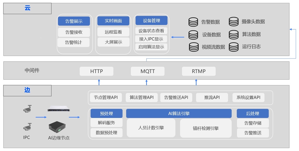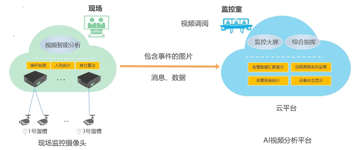 系统架构考虑到矿井下复杂的环境,加上多条生产线分属不同矿区相隔很远,为方便多套设备统一管理,决定使用智驱力晓知精灵ks968-m1边缘设备结合晓知精灵上位机的“云管边端”部署模式。